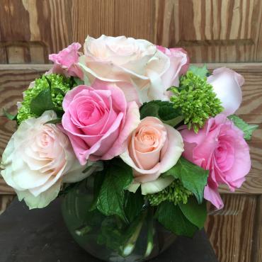 In small square or bubble bowl, perfect for the dorm room or sorority house. Delta Zeta pink roses and lillies with filler