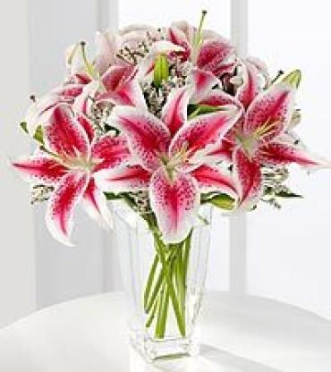 Beautiful lilies in a clear vase, availabe in pinks, white or yellow