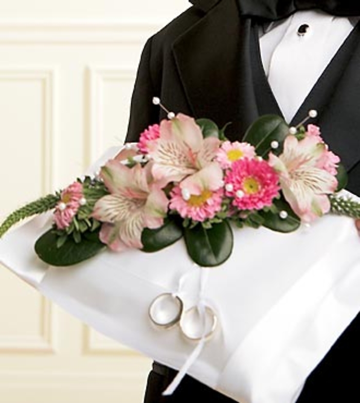 The little ring bearer will proudly carry this ring pillow adorned with pink Matsumoto asters, white Veronica and alstroemeria accented with pale green satin ribbon. Price depends on the pillow cost